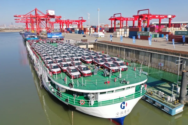 1月15日,首艘“330车”内河滚装船“航通01号”交付运营,开通运营合肥—上海汽车滚装航线,结束合肥造汽车依赖公路发运至上海的历史。1月21日,首艘“7000车位”远洋滚装运输船“黄鹄号”投入运营,开通上海—地中海汽车滚装航线,服务汽车出口进入“自有船”运营新阶段,正式迈入“大船时代”“远洋时代”。2月28日,与山东港口集团合资的安徽港航陆海装备公司枞阳船厂开工,为港航发展注入新动能。