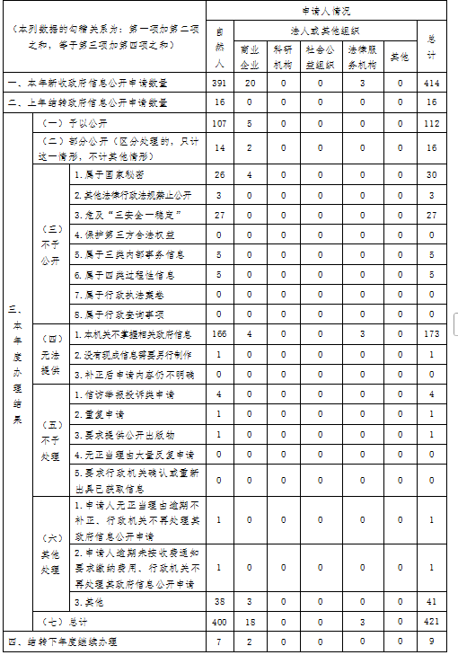 (二)依申请公开情况。全年共收到信息公开申请414件,上年度结转办理16件,已按规定办结421件,结转下年度办理9件。已办结的申请中,予以公开112件、部分公开16件、不予公开70件、无法提供174件、不予处理6件、其他处理43件;因信息公开被申请行政复议0件、提起行政诉讼14件。提起的行政诉讼,为未经复议直接起诉件,其中结果维持13件,尚未审结1件。