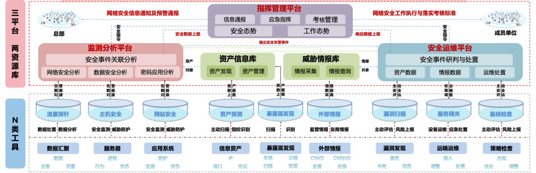 “两库”关联对接着“三平台”,即监测平台,运维平台和指挥平台。监测平台致力于在可能的攻击发生前,“料敌于先”;运维平台则是在攻击发生前,发生中和发生后,及时有效响应和处置问题;指挥平台则需要在央国企或是政务部门等多层级机构中“拉穿”各级,从而助力责任压实。