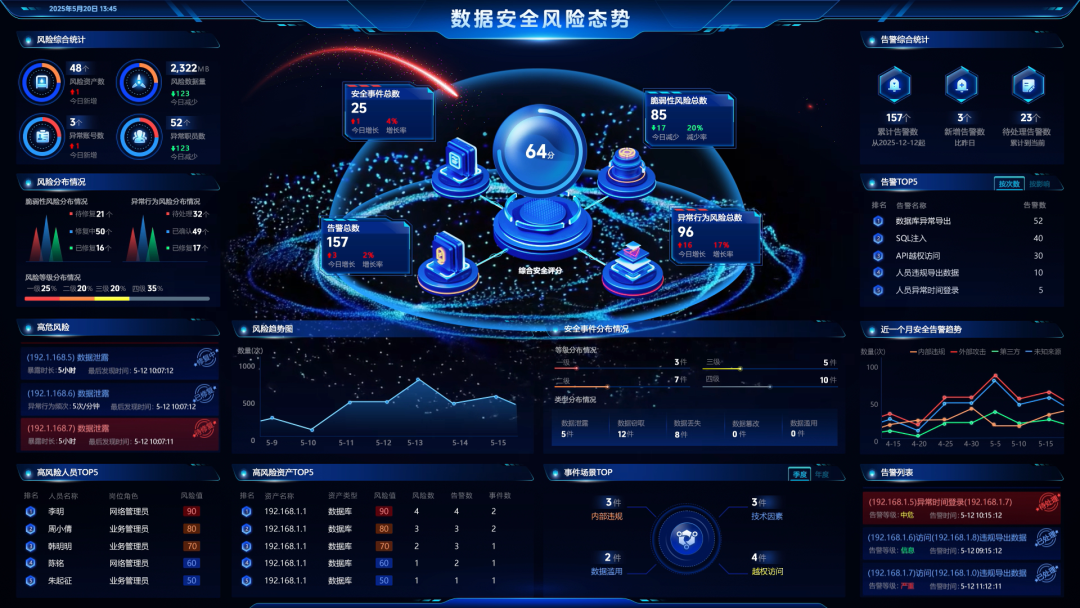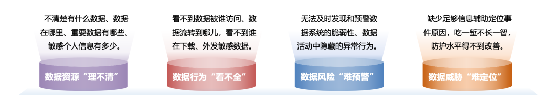 数据是新时代重要的生产要素,央国企、政务机构中有许多数据规模已达到TB级。然而,随着数据规模的极速增长,数据管理上面临着资源理不清、行为看不全、风险难预警、威胁难定位等问题。