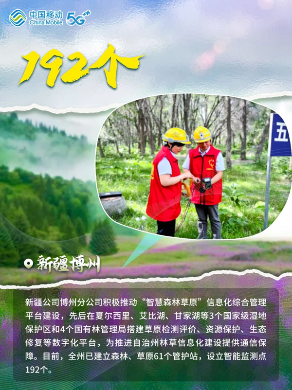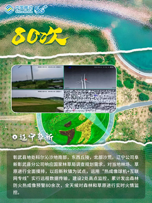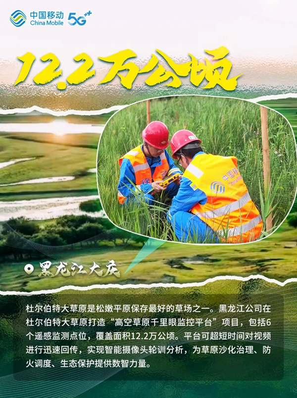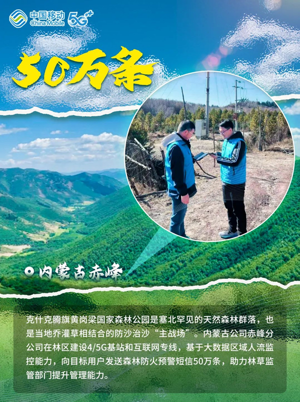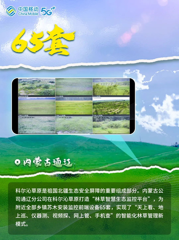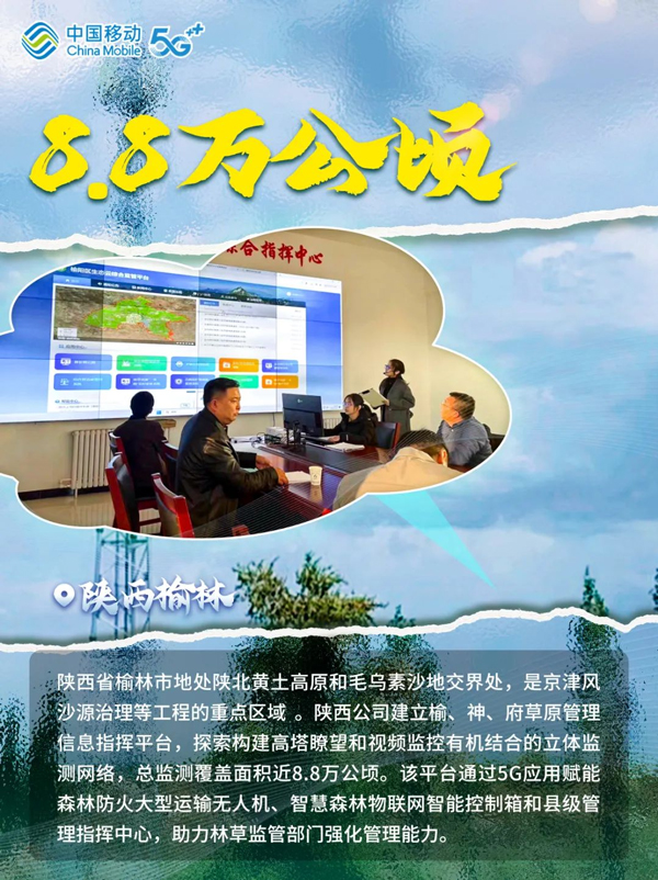 绿水逶迤去,青山相向开。多年来,从“三北”防护林体系建设到京津风沙源治理,从“退耕还林”到“复垦归田”,从“大漠风尘日色昏”到“黄沙止步绿意浓”,中国创造了一系列防沙治沙新奇迹。在这场“绿进沙退”的伟大斗争中,中国移动贯彻落实“绿水青山就是金山银山”的发展理念,在以数智技术助力防沙治沙和生态保护中展现新作为。