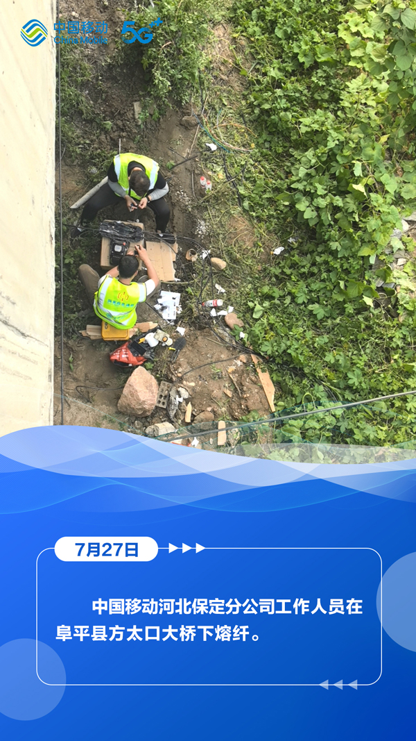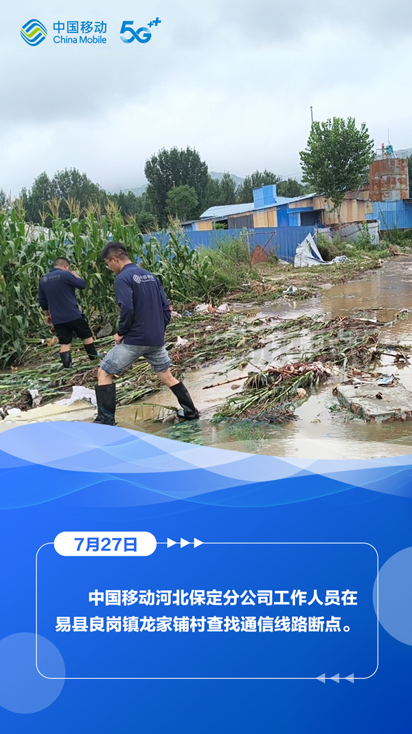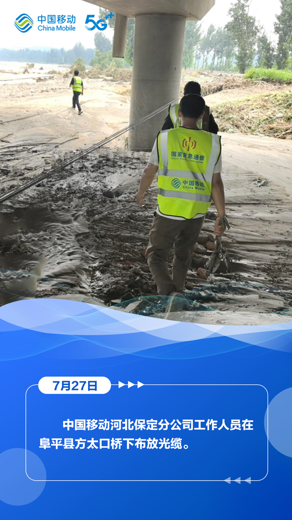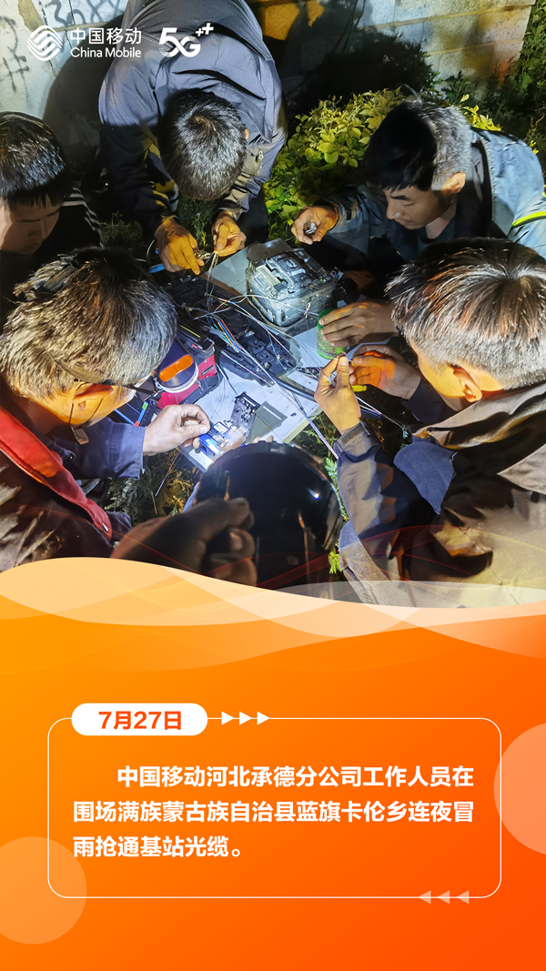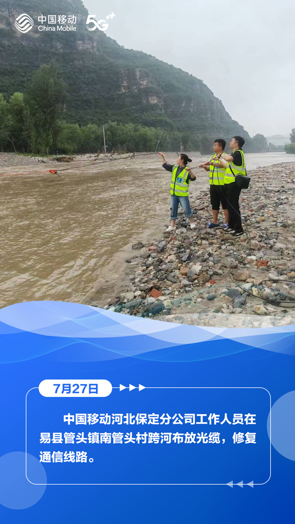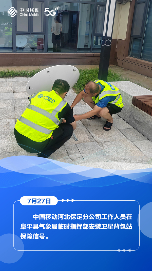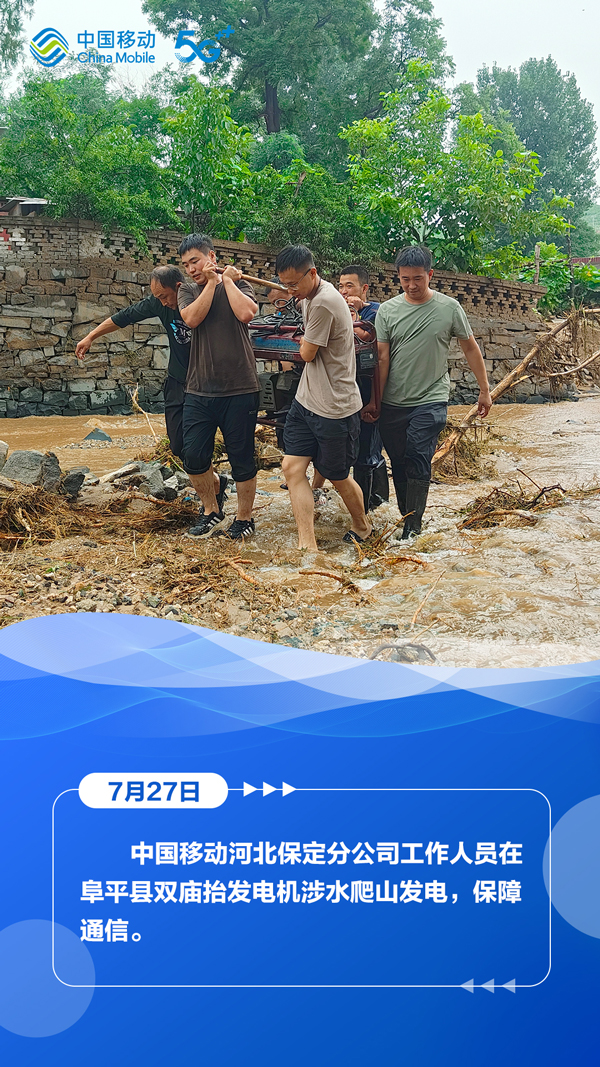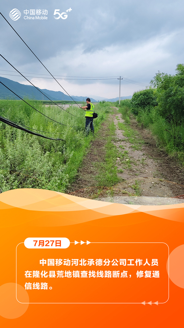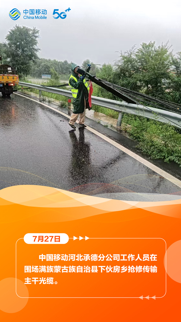 7月27日,河北省气象台、省水利厅和省气象局、省自然资源厅与省气象局继续发布暴雨蓝色预警、山洪灾害气象风险蓝色预警、地质灾害气象风险预警。在滚滚洪流中,中国移动以“汛”为“令”,全力抢修受灾区域通信,在暴雨中架起通信“生命线”,为受灾群众点亮着希望。