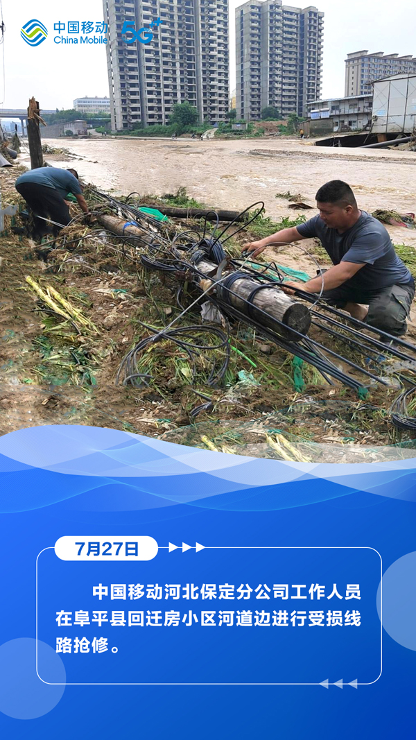 截至7月28日12时,河北公司累计出动保障人员1200余人次、抢修车辆378辆次、发电油机705台次、卫星电话47部、卫星背包基站17套、应急通信车6辆,已抢通基站859个,正在全力抢修其余退服基站。通过短信、中国移动APP、移动高清等,协助地方政府及时发送恶劣天气及灾害防范预警应急信息超2亿条。为应急、气象、交通等重点部门单位开通免停机服务。在营业厅和热线开通绿色通道,上线视频AI客服,处理群众紧急服务需求5000余件。