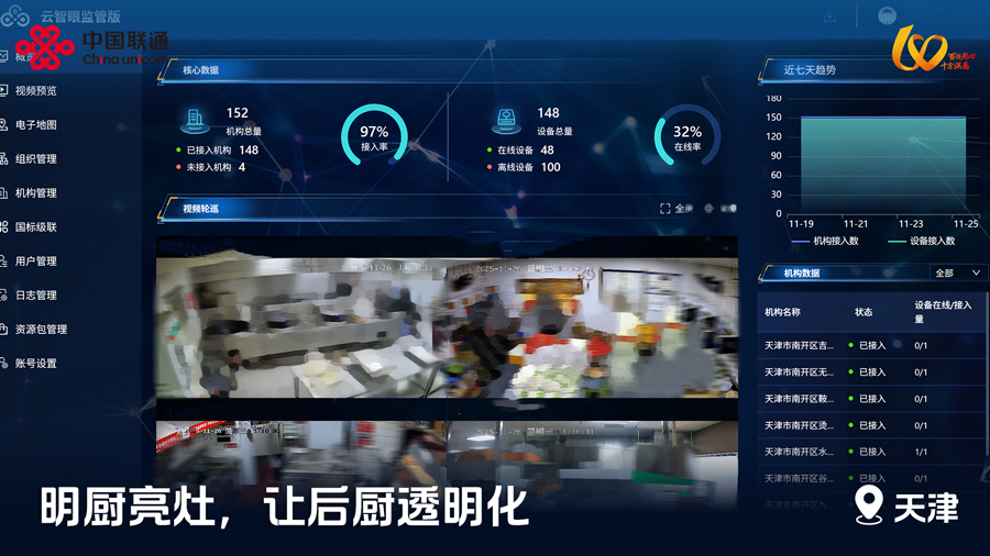 中国联通天津市分公司推行“互联网+明厨亮灶”智慧管理模式,通过在后厨关键区域安装高清摄像设备,将视频信号实时传输至监管平台,让餐饮服务的后厨从幕后走向台前,保障了消费者的知情权与监督权,构筑了公开透明的食品安全环境,大幅提升了监管效能,为“舌尖上的安全”提供了坚实的数字化保障。