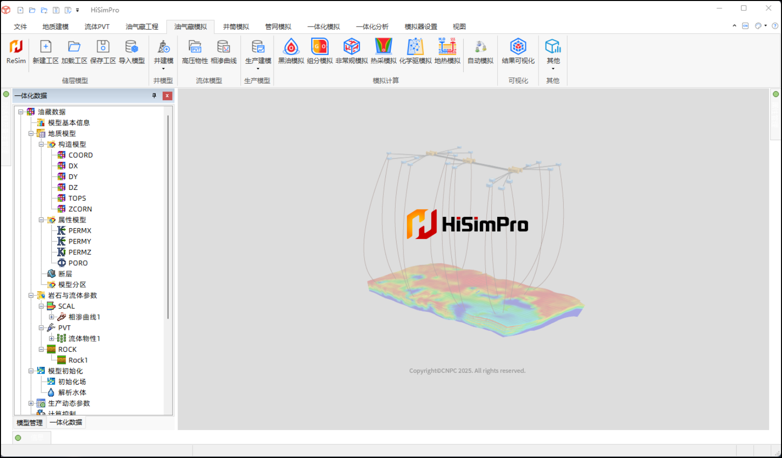 中国石油自主研发油气藏数值模拟HiSim软件平台,结合自主可控采油模拟软件和管网模拟软件,研发形成油气藏工程、采油气工程、集输工程一体化专业动态仿真国产工业化软件HiSimPro。该软件具备强大的工业级仿真能力,涵盖油气藏动态仿真、油气藏流动机理模型、井筒动态仿真、管网动态仿真及一体化模拟分析为主的5大一级功能模块,以及黑油模拟、组分模拟、非常规模拟、油气藏IPR计算、井筒多相流计算、管网流体模拟、一体化耦合模拟等24个二级功能模块,支持亿级网格与千井级油气藏模拟、50口以上压裂水平井的复杂模拟、300口井以上井筒管网系统仿真和9种井筒设备模拟。