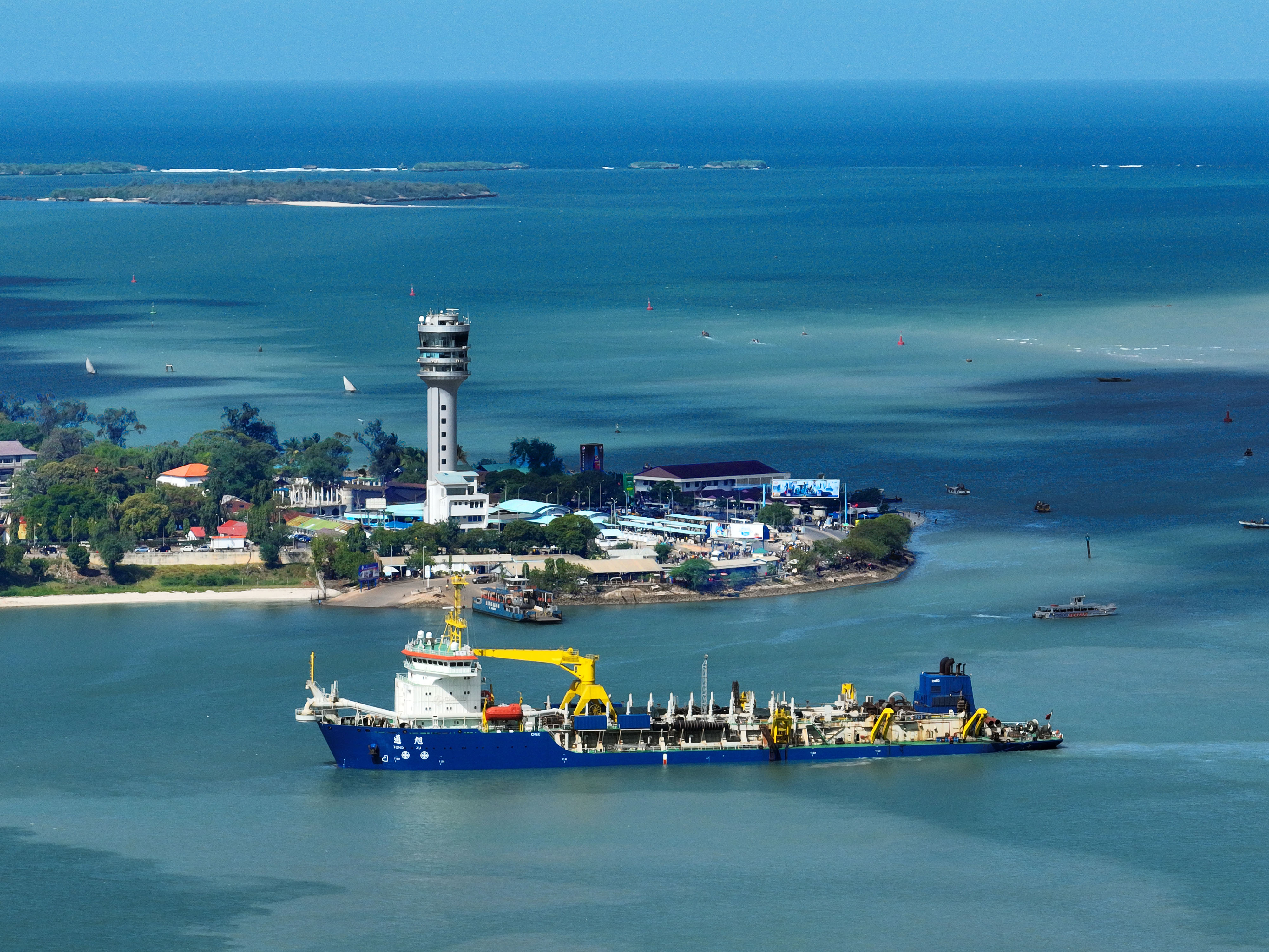 中国自主设计、投资建造的重型自航耙吸式挖泥船“通旭”号正在达累斯萨拉姆港进行疏浚作业。