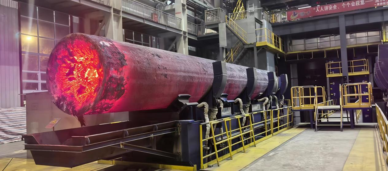 近日,中国一重材料产业部的垂直铸机工序车间内,随着铸坯平稳完成冷却,一根直径1.6米、长度12.5米的超大直径超长尺寸垂直铸坯正式诞生,成功打破了中国一重2025年创造的直径1.6米、长度12.26米垂直铸坯的世界纪录,再次刷新了垂直连铸领域的技术巅峰,为我国高端重型装备用超大规格特种钢坯的自主化生产写下了浓墨重彩的一笔。