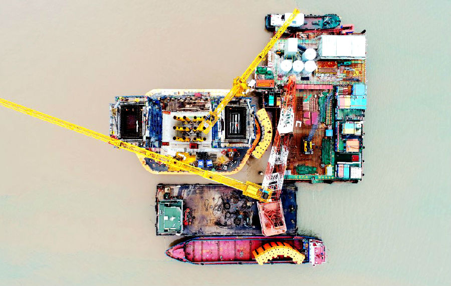 近日,在舟岱跨海大桥主通航孔桥ZT3#主墩施工平台现场,国内首个内外双层防撞钢套箱外层首块钢套箱安装完成,拉开了该桥梁外层防撞钢套箱安装工作序幕。