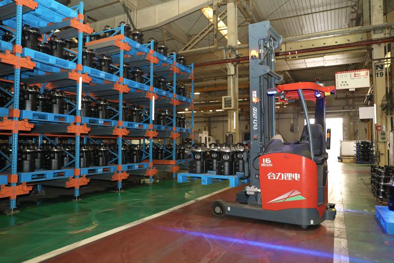 在合力叉车的车间,几台无人叉车正在忙碌着,6个高大的货架上不规则摆放着一些货物,叉车都能够准确识别取货,同时还能够将地面上的货物准确放入指定货架上。