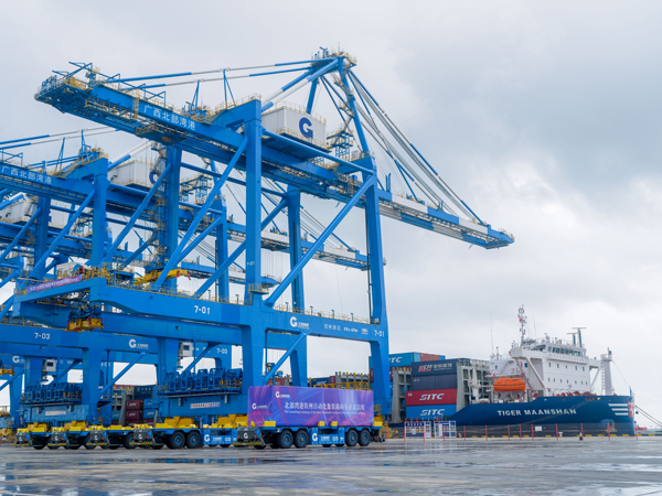2022年8月29日,54车满载来自越南线槽、海南椰子汁等货物的海铁联运集装箱班列从钦州港站开出,驶向重庆团结村站,这是西部陆海新通道海铁联运班列第20000列。5年零4个月,从“0”到“20000”,新通道班列实现了的飞跃发展。广西北部湾国际港务集团沿海港口吞吐能力从千万吨提高到2.69亿吨,集装箱吞吐量突破600万标箱、西部陆海新通道班列开行突破6000列,在全国沿海港口中分别排第9位和第8位。西部陆海新通道海铁联运班列覆盖13省47市92站点,线路达到79条。
