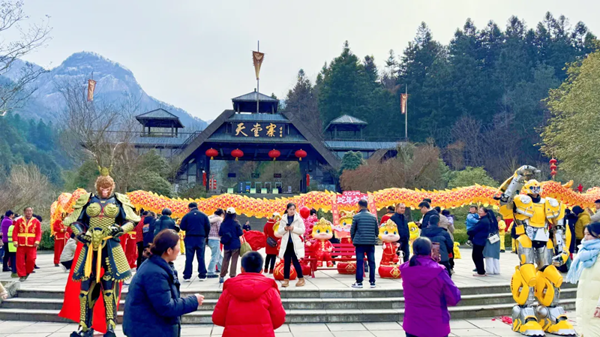 天堂寨景区在延续“寨里欢喜过大年”主题活动基础上,创新打造特色体验,跨年许愿、送春联、土猪宴、机甲巡游等特色项目,成功吸引来自不同国家的游客体验中国传统文化,春节假期前三天接待量同比增长 73.06%,实现传统文化IP的年轻化、国际化破圈传播。