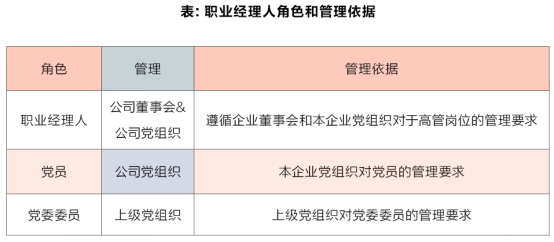 职业经理人的管理和组织任命干部管理要求存在差异:职业经理人应该遵循企业董事会和本企业党组织对高管岗位的管理要求,如果职业经理人是党员,他同时应该遵循本企业党组织对党员管理的管理要求,如果职业经理人进入党委交叉任职还应该遵循上级党组织对党委委员的管理要求;组织任命干部应遵循企业董事会管理和上级党组织(遵循谁任命谁管理原则)对干部的管理要求。