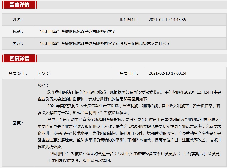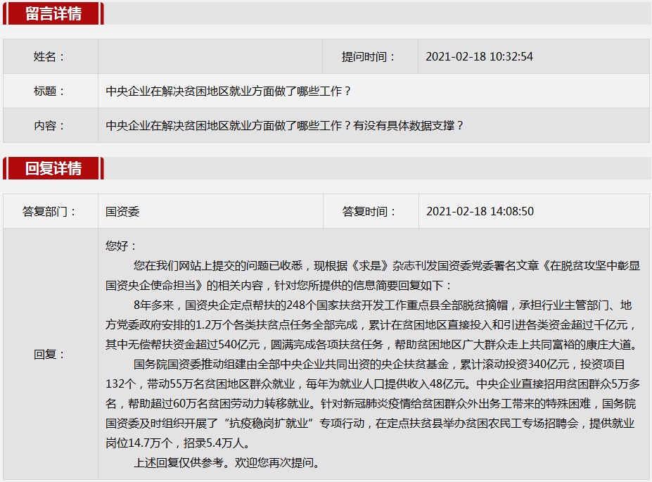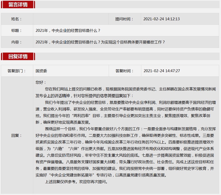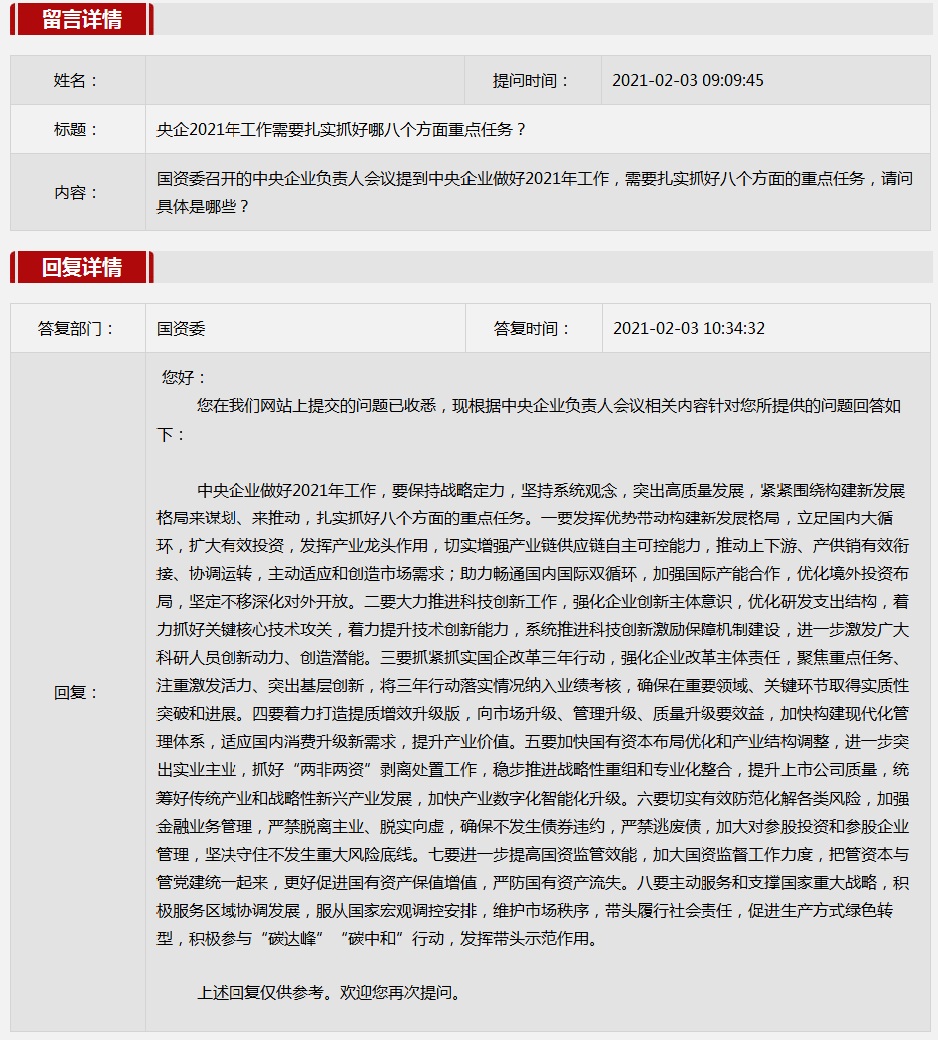 2021年2月国资委网站政务咨询栏目部分网友提出的咨询,我们初步做出了认真的回应,现选择五条关注度高、点击量高的问题,再次推荐分享。