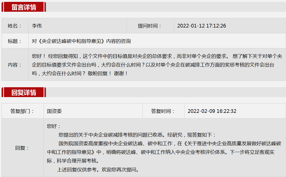 1.对《央企碳达峰碳中和指导意见》内容的咨询。