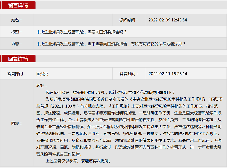 2022年2月国资委网站政务咨询栏目部分网友提出的咨询,我们初步做出了认真的回应,现选择五条关注度高、点击量高的问题,再次推荐分享。