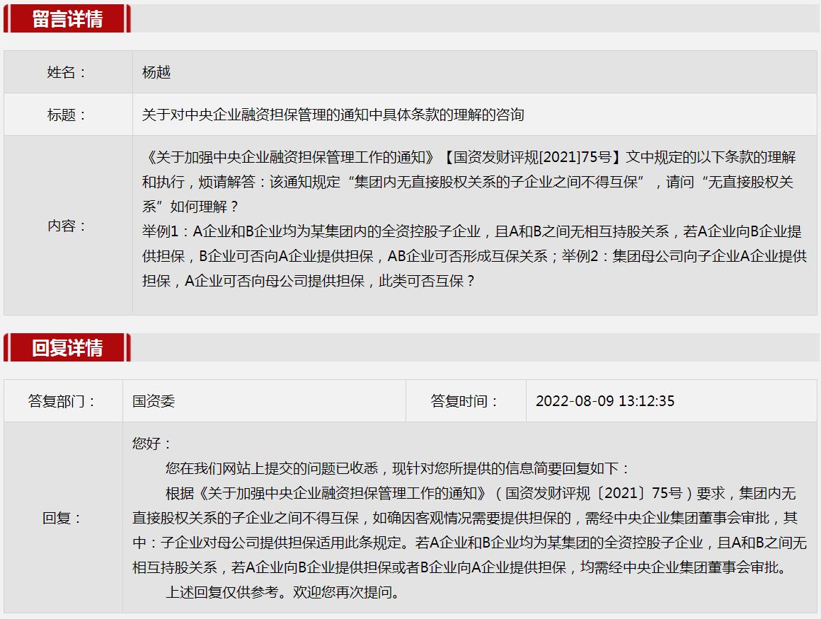 2.关于对中央企业融资担保管理的通知中具体条款的理解的咨询。