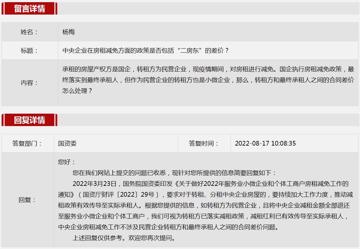 4.中央企业在房租减免方面的政策是否包括“二房东”的差价?