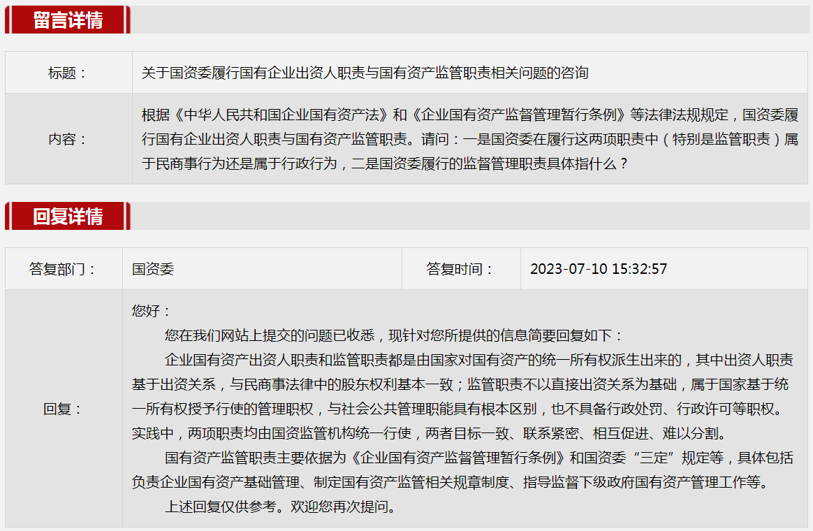 1.关于国资委履行国有企业出资人职责与国有资产监管职责相关问题的咨询。