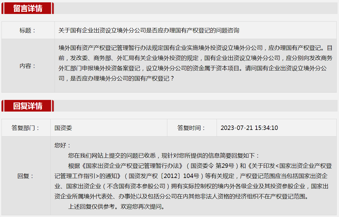 4.关于国有企业出资设立境外分公司是否应办理国有产权登记的问题咨询。