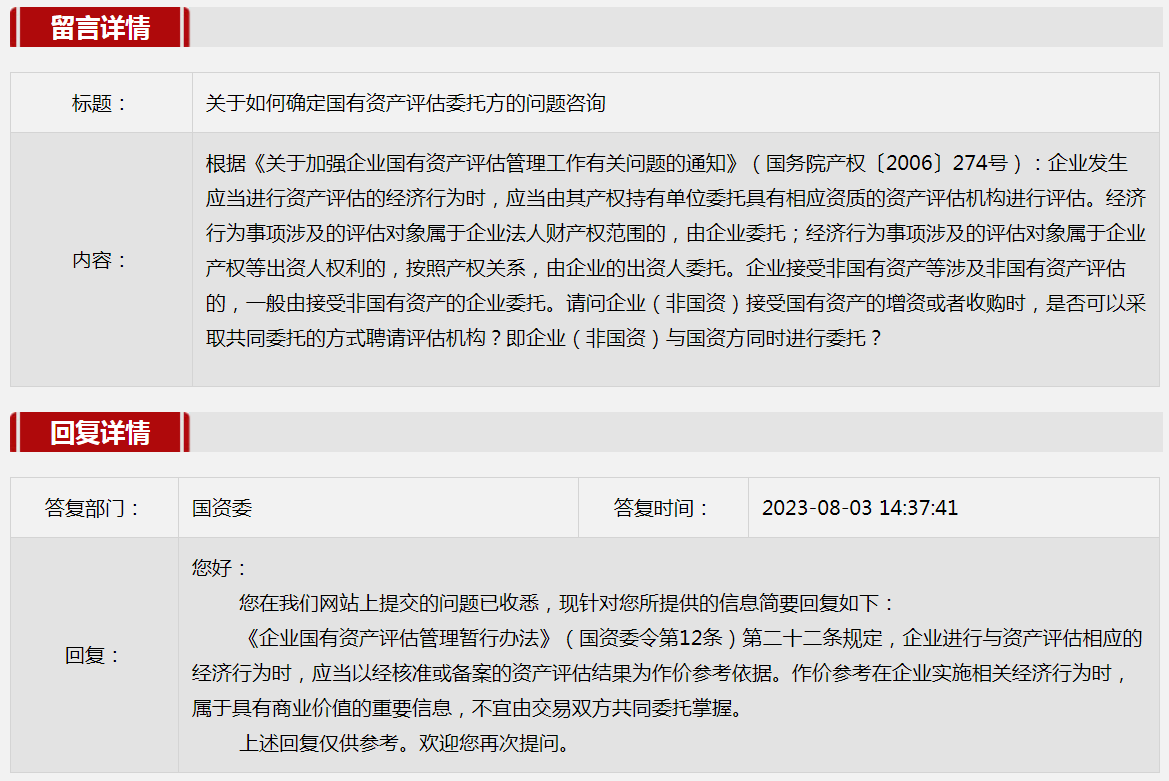 2023年8月国资委网站政务咨询栏目部分网友提出的咨询,我们初步做出了认真的回应,现选择五条关注度高、点击量高的问题,再次推荐分享。