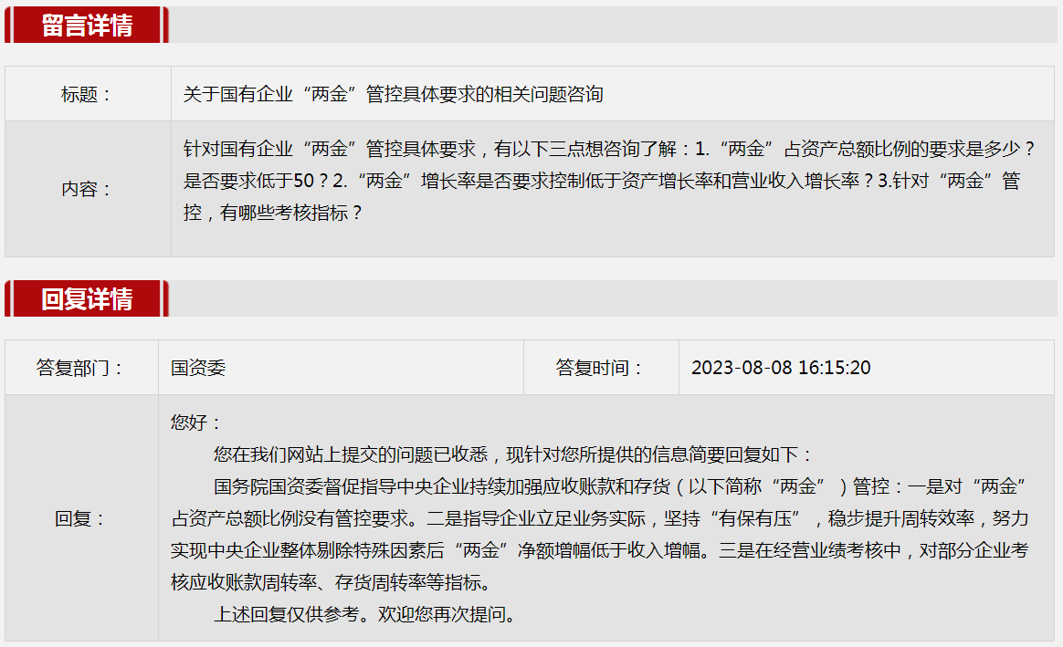 2.关于国有企业“两金”管控具体要求的相关问题咨询。