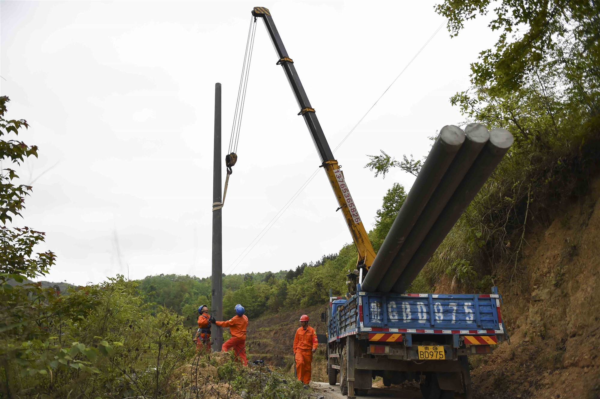 在贵州紫云县松山街道同心村,电力施工人员全力加速建设,让村民早日用上安全电、舒心电。陈娟 摄