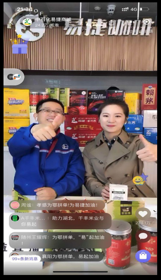 疫情发生以来,为解决农产品滞销和消费者购物不便的难题,中石化易捷发挥全国一盘棋的统筹协调作用,制定了详细的帮销措施,线上线下齐发力。易捷网上商城在全国范围上线,开设“帮鄂拼一单”湖北农产品专区,组织小龙虾、脐橙、茶叶等60余款农产品上架销售,以最快的速度在客户和湖北农产品厂家建立沟通。易捷总裁亲自直播带货,帮助销售小龙虾、脐橙、恩施硒茶等湖北农产品,一个半小时的直播吸引24.3万人观看,274.6万人点赞。线下易捷店也紧锣密鼓地开展多种营销,在客流量大的站点设置“助力湖北、爱心援购”促销专区,实行海报、LED、口口相传等多维度、立体式营销。同时,实行走出去策略,鼓励员工及大客户团购。