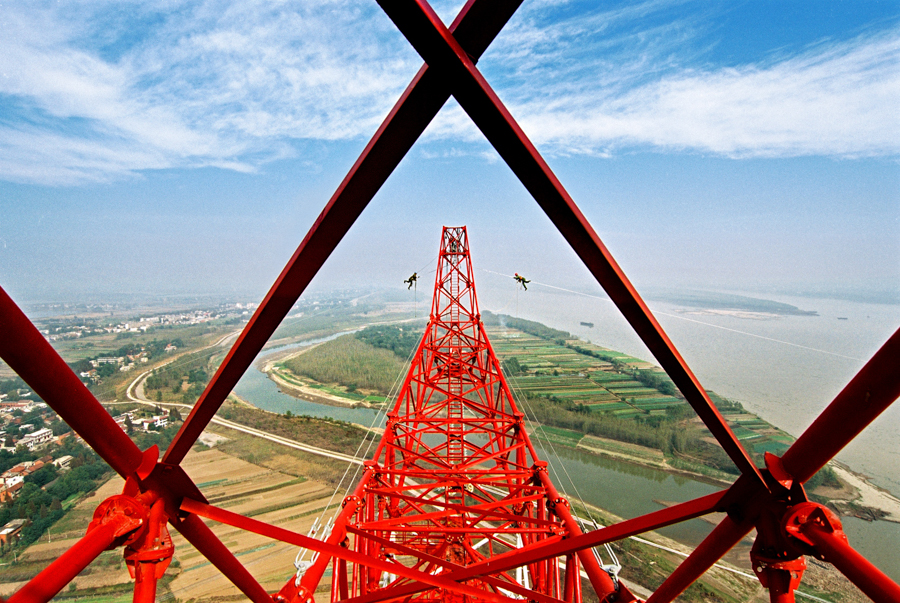 作品说明:2007年7月,在湖北黄石500千伏黄黄输电线路跨长江塔上,施工人员安装地线防震锤,当年,湖北电网500千伏环网工程建成,为湖北经济发展提供可靠能源保障。