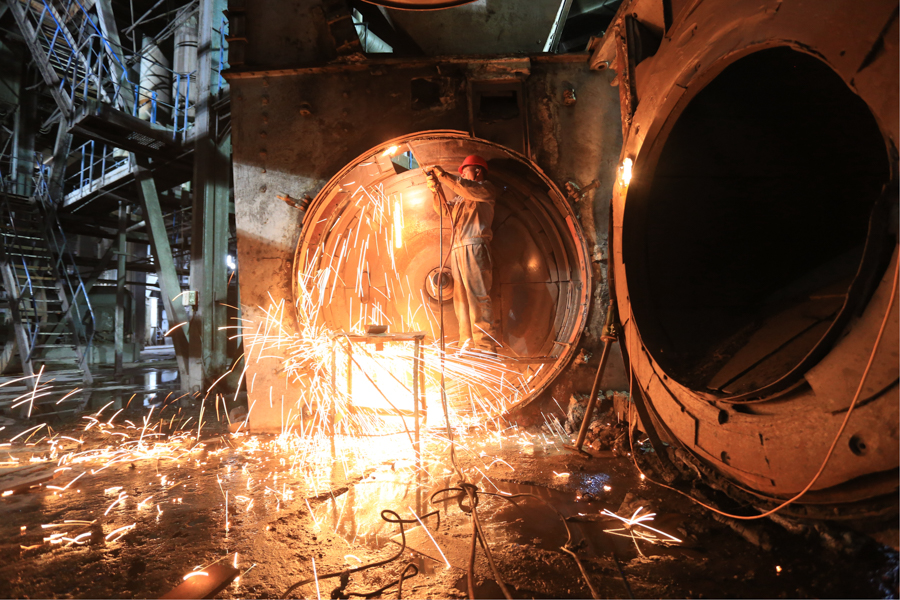 作品说明:2016年6月12日,锡林郭勒热电有限责任公司检修工人对二号磨煤机进行维修。