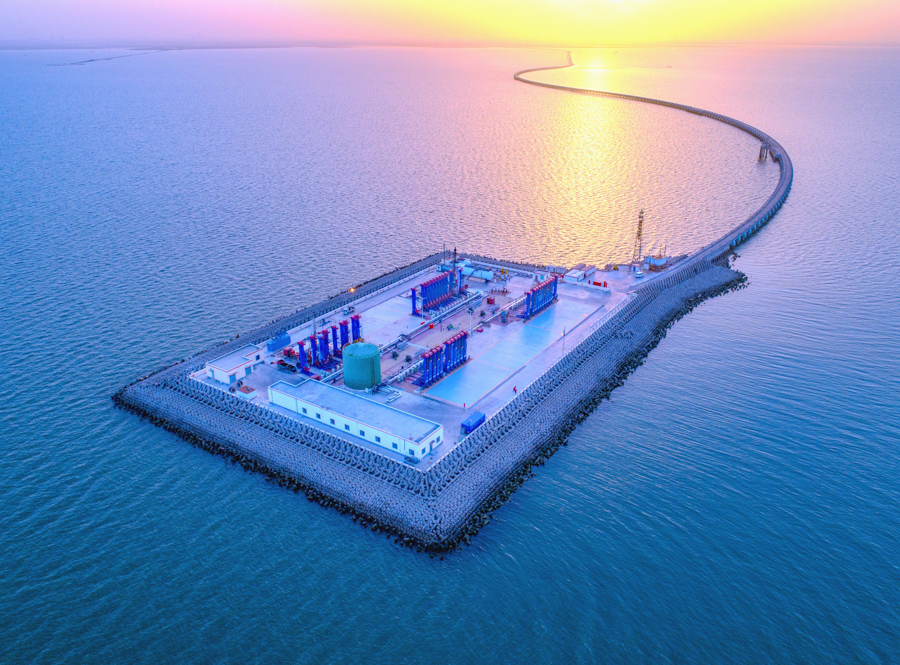 作品说明:胜利油田坚持“绿水青山就是金山银山”的理念,对青东5 区块以海油陆采开发模式进行开采,实现油田开发与环境和谐统一。目前,该区块共有油水井64口,年产能18.5 万吨,拥有滩海陆岸平台1 座、陆岸终端站1 座,实现工区污水零排放、零污染,是胜利滩海油田“四化”建设示范区。图为2018年5月23日拍摄的山东东营胜利油田青东5 区块海油陆采平台。